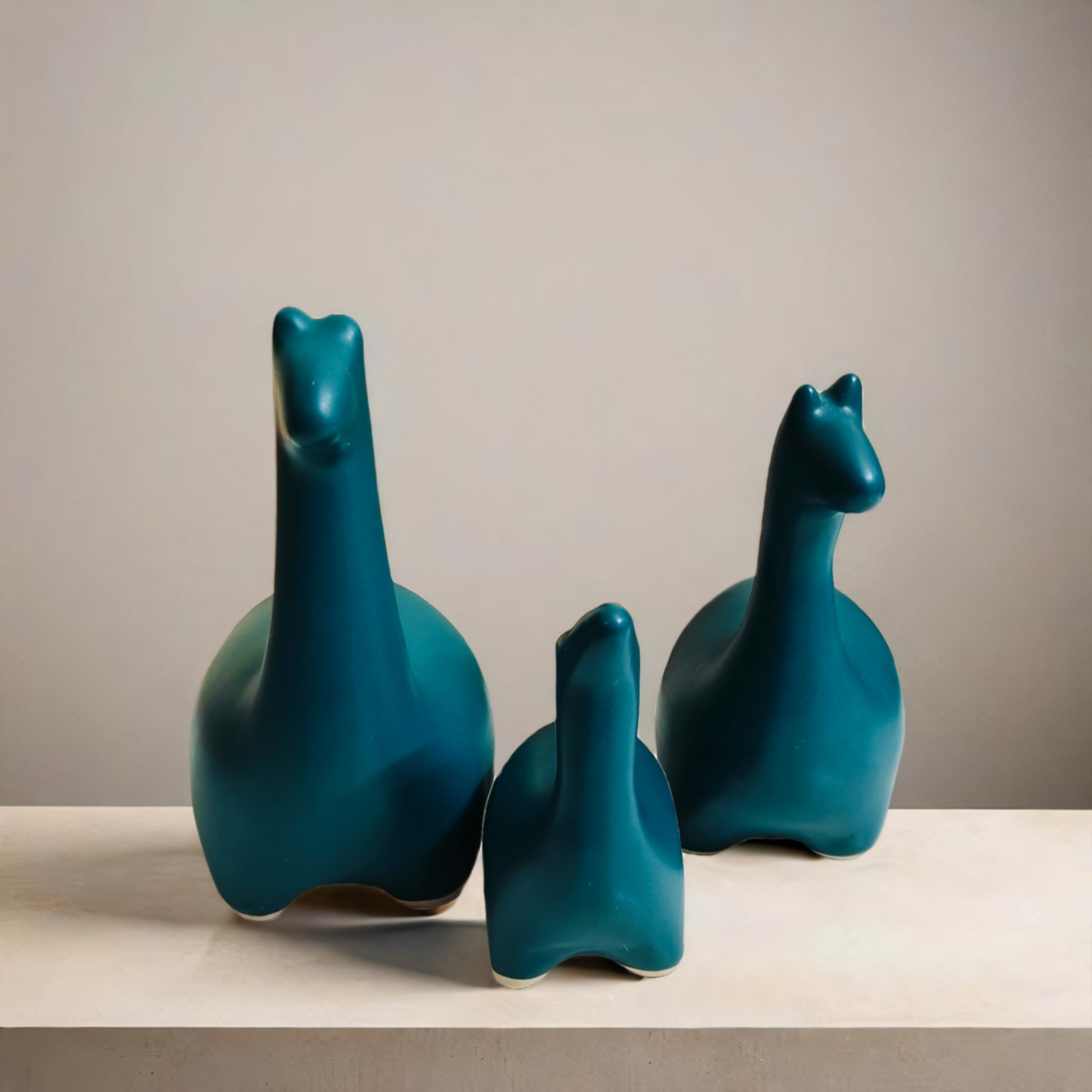 Add a touch of whimsy to your home décor with this charming set of three ceramic dinosaur figurines. Each piece is expertly crafted in a sophisticated teal green finish that brings a contemporary twist to these prehistoric creatures. The smooth, matte surface and minimalist design make these decorative pieces both modern and playful. Perfect as shelf accessories, desk companions, or as striking centrepieces, these dinosaurs create an engaging visual narrative wherever they're displayed. The varying sizes and poses of the figurines create an interesting dynamic when grouped together. Their sleek, curved forms and simplified silhouettes strike an ideal balance between artistic sophistication and playful charm. These versatile decorative pieces work beautifully in any room, from a study to a child's bedroom, adding character and visual interest to your space.